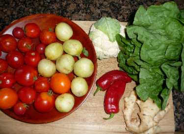 This is another very hearty dish, great for the winter months when the cauliflower is at its best. The proportions of each food and the ratio to each are dependent on how thin or thick you’d like to make the chowder. I usually just play with it and add cukes and tomatoes to make it thinner and the other ingredients to make it thicker.