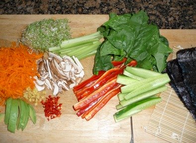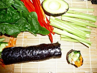 Lay out your nori and place veggies inside keeping them uniform all the way across the short side. Begin rolling from that end holding in the ingredients tightly as you go. When you get to the end you can dab a little water to help the roll seal and stay closed.