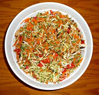 This is a nice change up from the usual green salad. It’s quite filling and very juicy which I love. It’s really tasty as is, but you could put some raw salad dressing on it you wanted. I use a simple box grater to shred the veggies, but you could use your food processor.